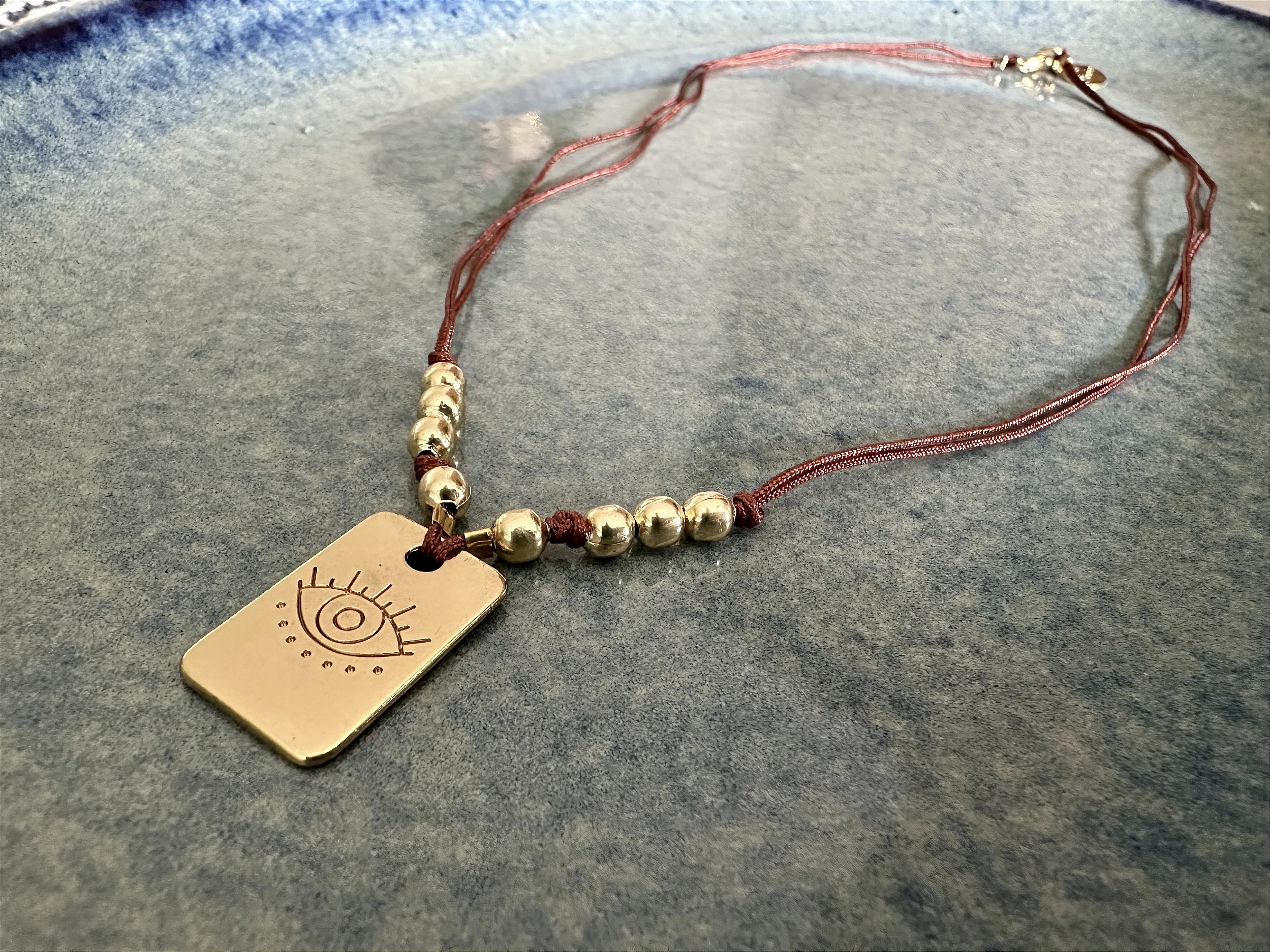 Colar com fio marrom e com pingente de plaquinha dourada com olho grego de um lado e os dizeres "Livrai-me do mal olhado" do outro.