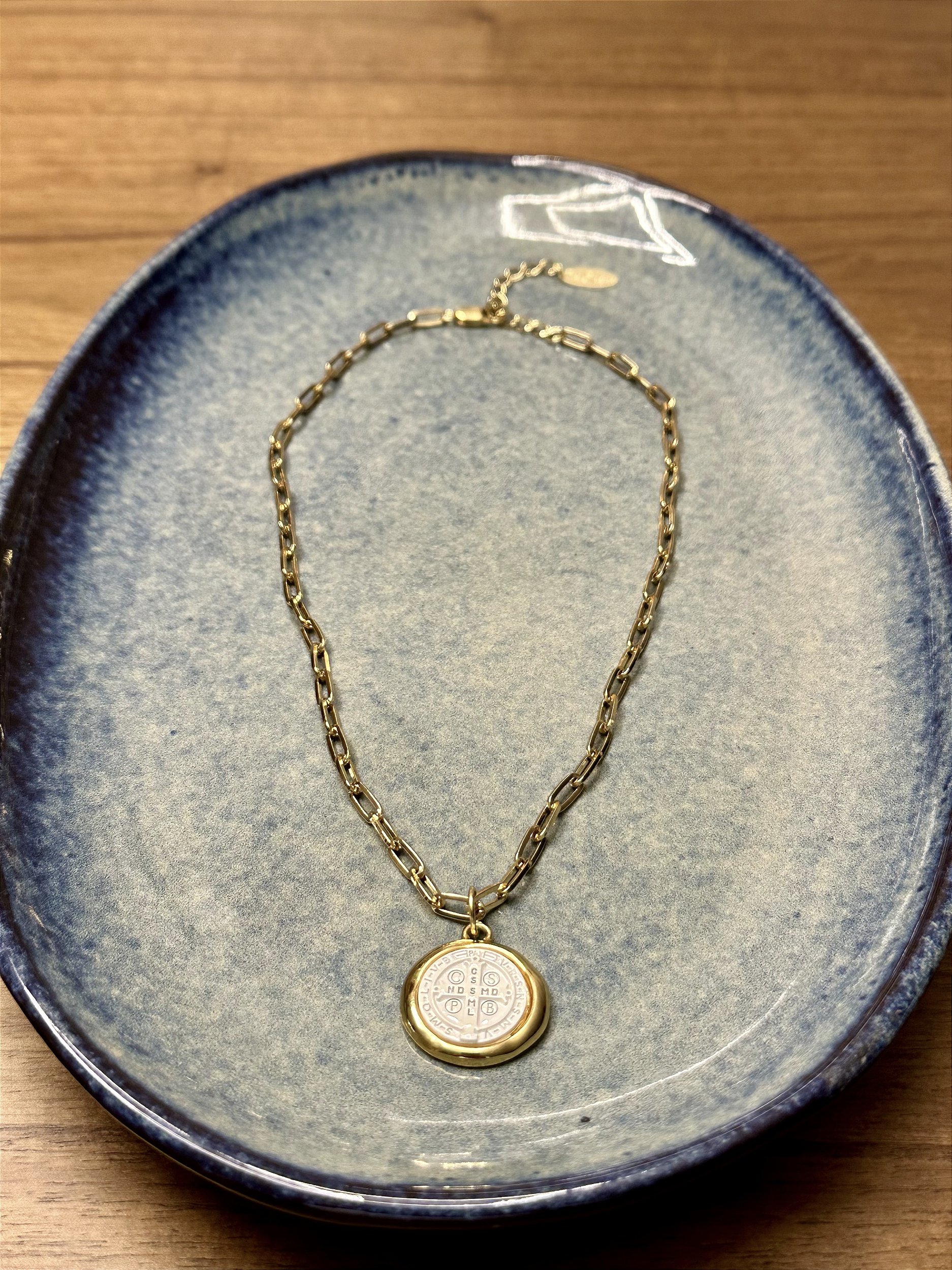 Colar feito com corrente dourada estilo cartier com pingente de São Bento.