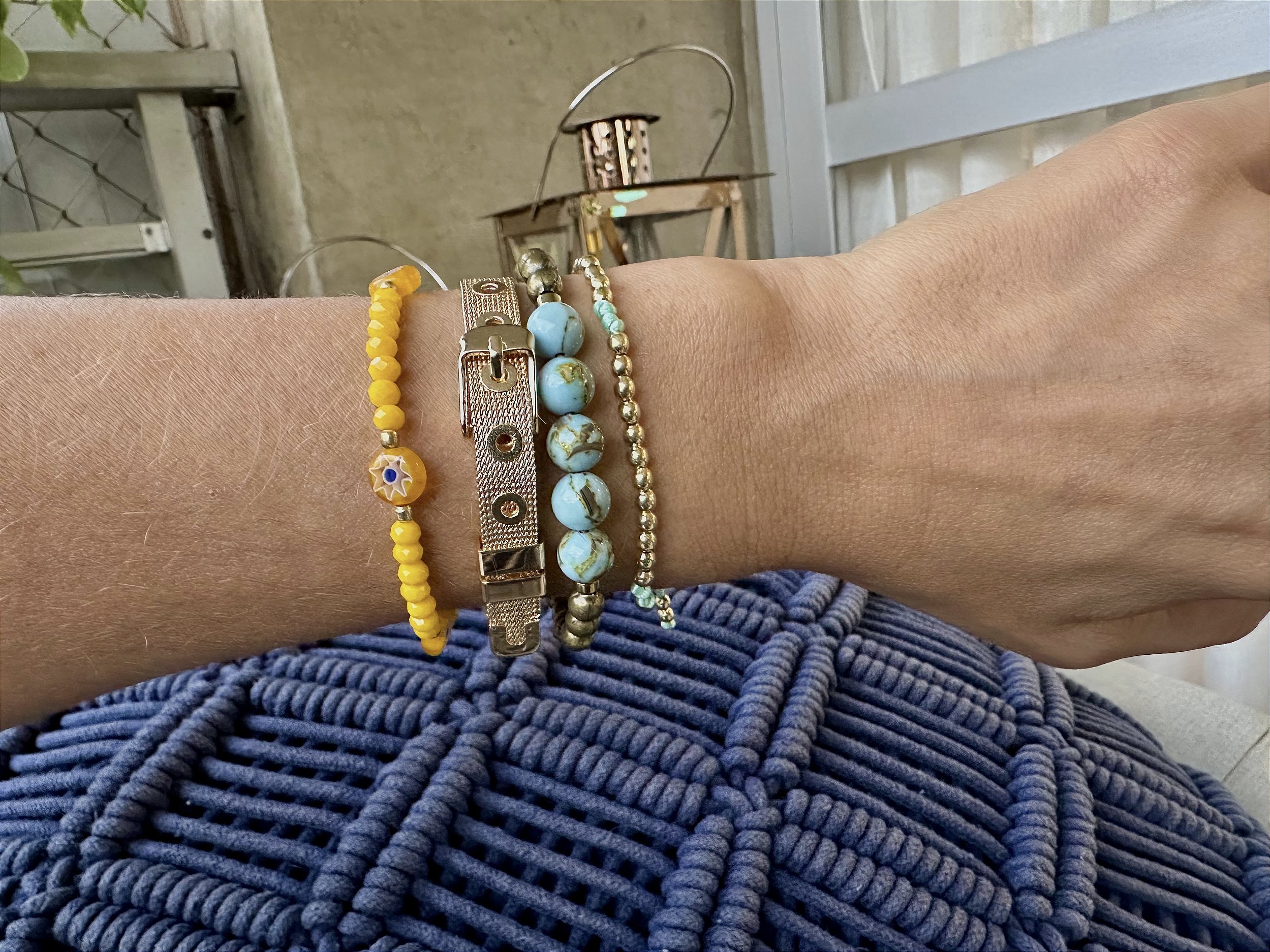 Kit composto por 4 pulseiras nos tons de azul e amarelo com acabamento dourado.