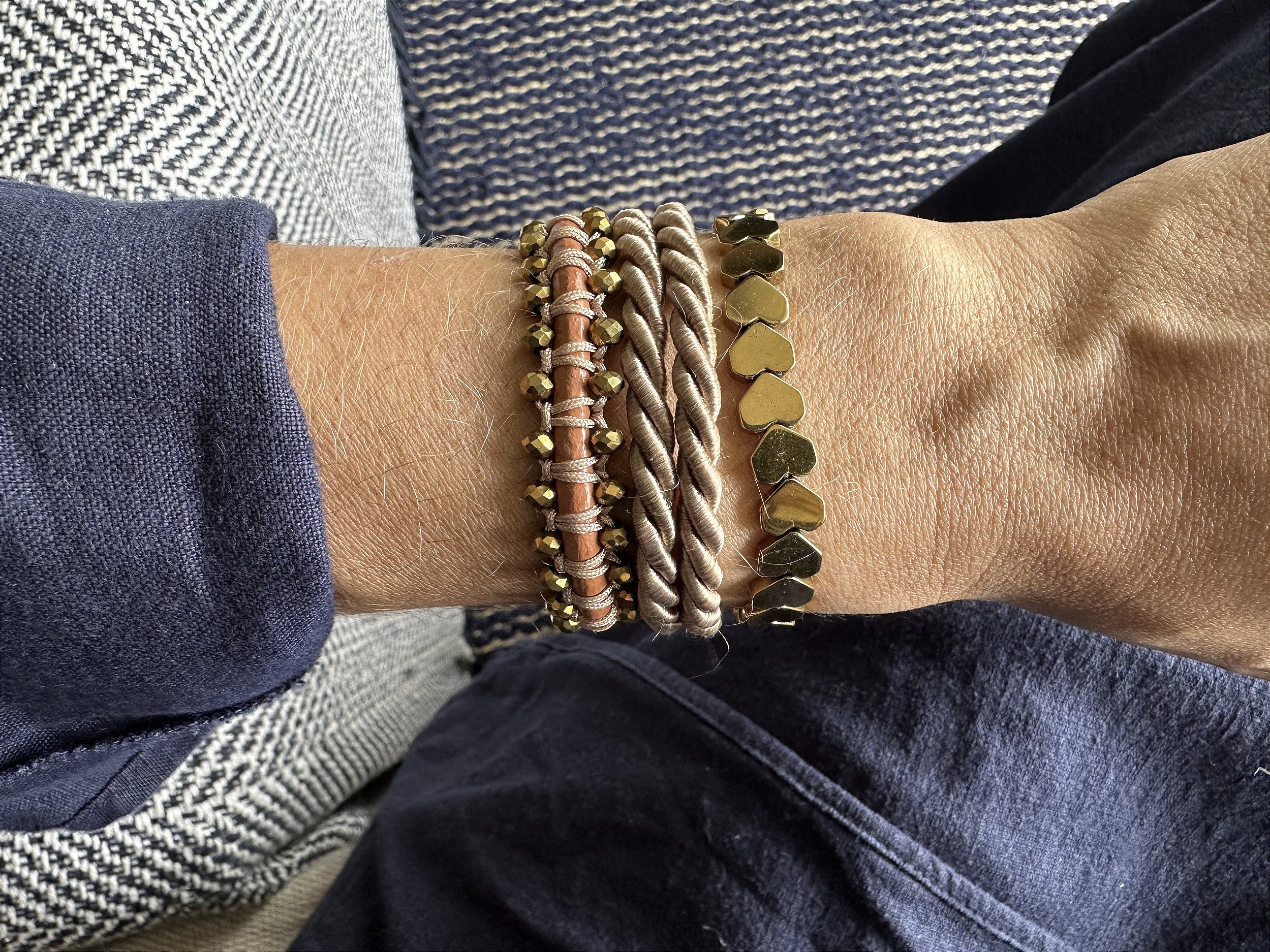 Kit composto por 3 pulseiras nos tons de bege e dourado.