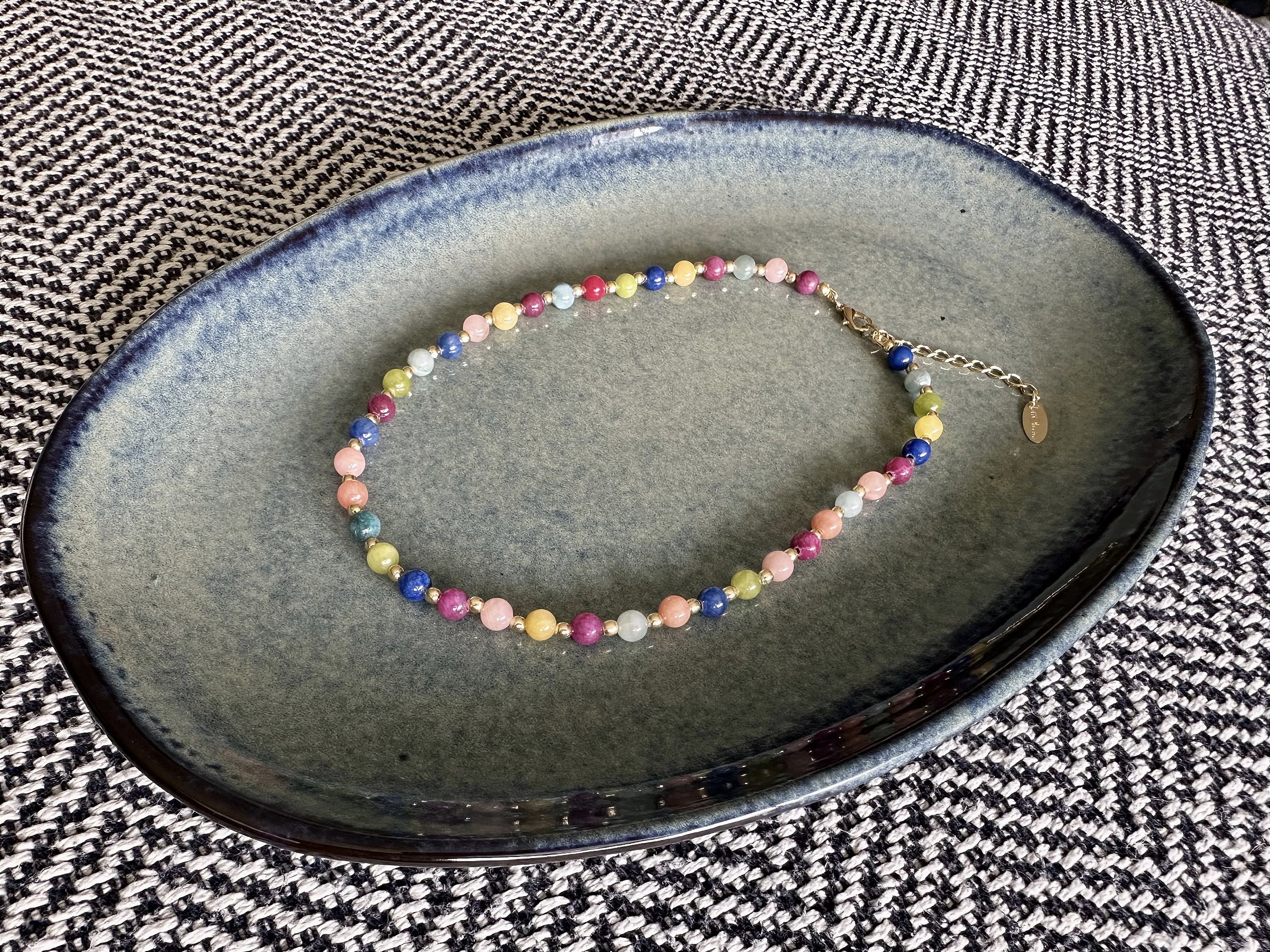 Colar charmoso que muda de qualquer look básico, ele é todo coloridinho e possui bolinhas douradas entre uma cor e outra.