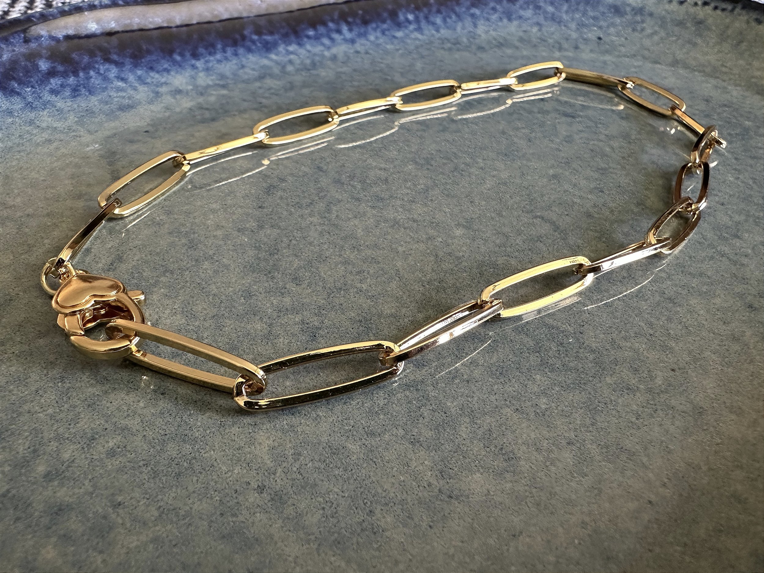 O colar elos dourado é uma tendência que chegou e ficou, ele vai bem tanto com looks casuais como com os mais sofisticados. Fica lindo se usado sozinho ou com outras peças criando novas composições.