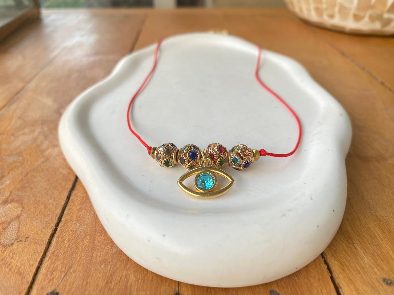 Colar com fio vermelho, com pingente dourado de olho grego e bolinhas de cristais cravejados.