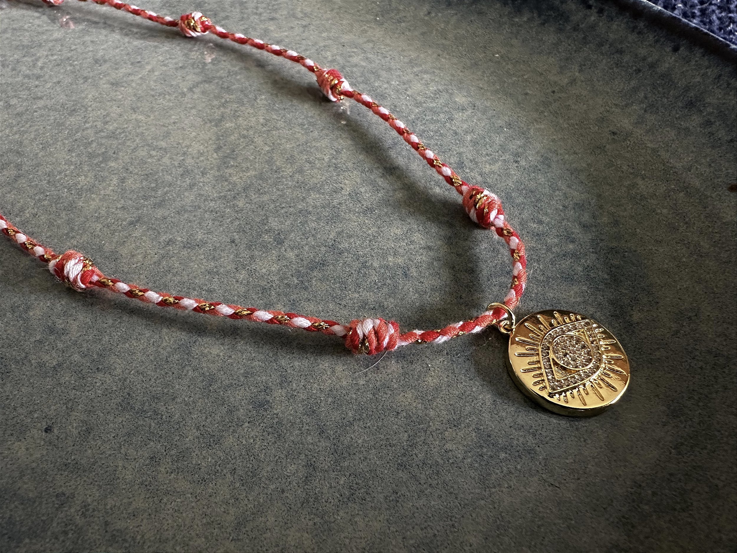 Esse colar fica simplesmente lindo!! Ele é feito com cordãozinho vermelho mesclado com branco e dourado e pingente medalha com olho grego.