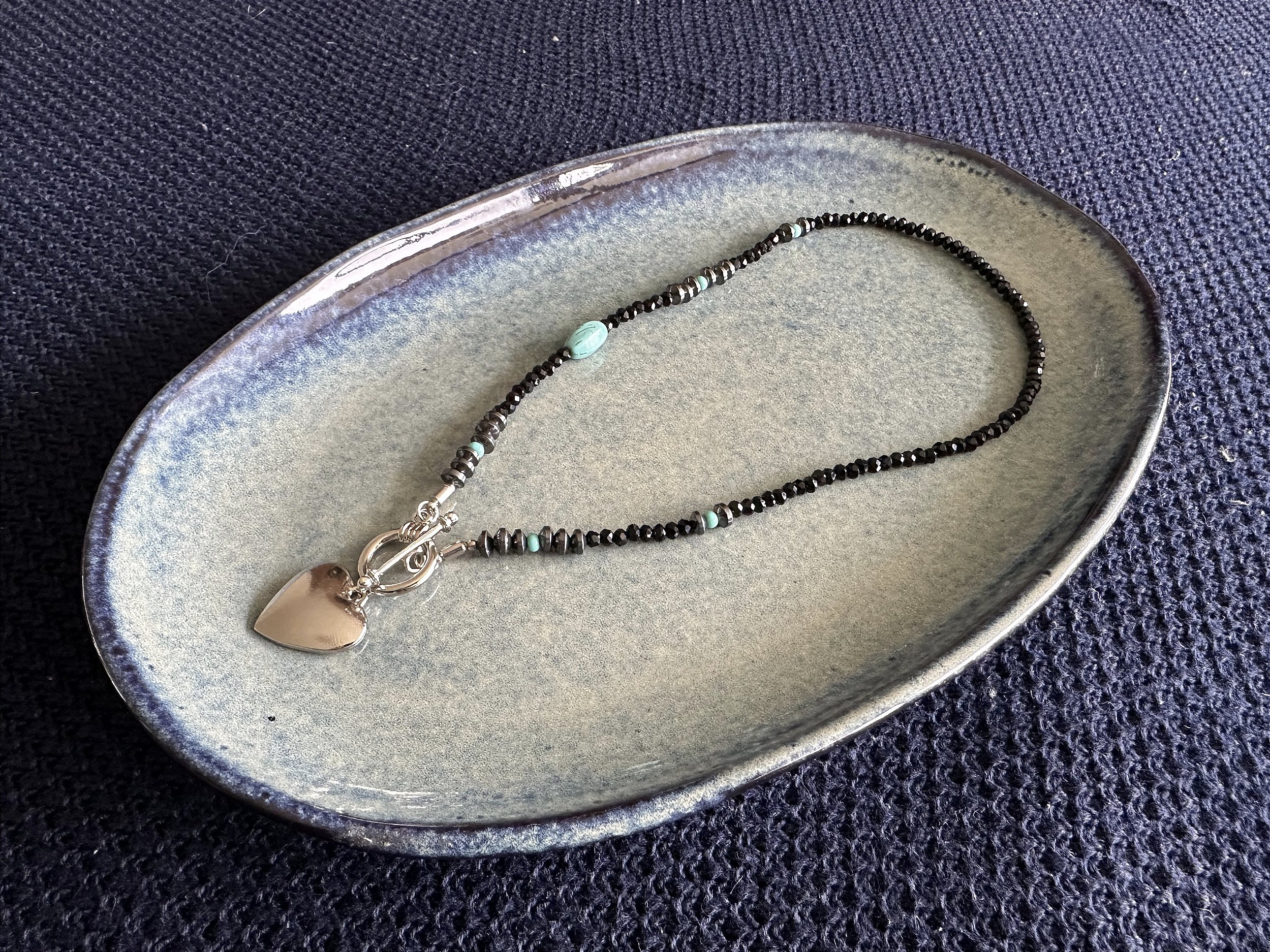 Colar feito com cristais pretos e detalhes de pedra turquesa. O destaque dele é o fecho na frente com pingente em formato de coração.
