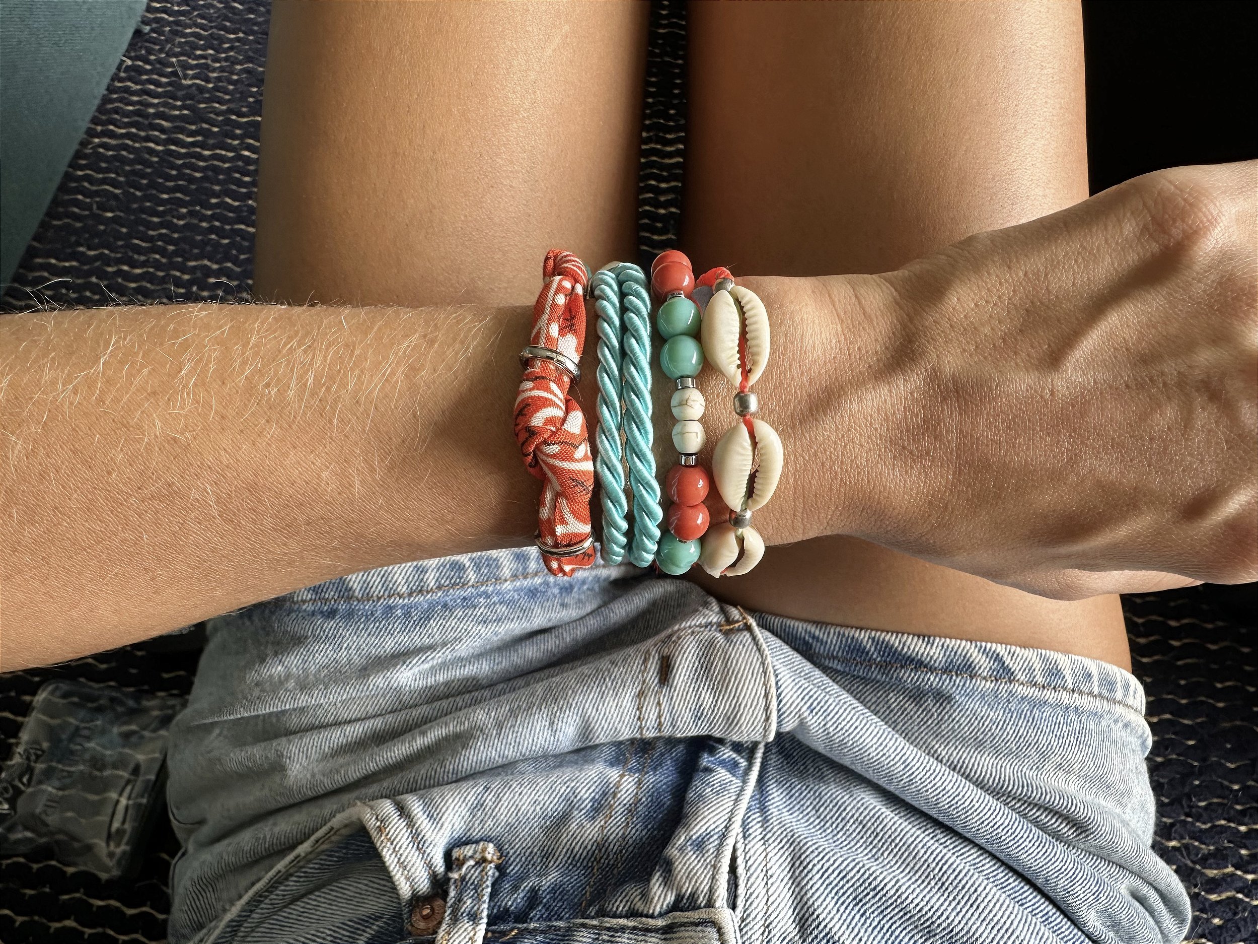 Kit composto por 4 pulseiras nos azul e laranja com diferentes estilos compondo um mix único.