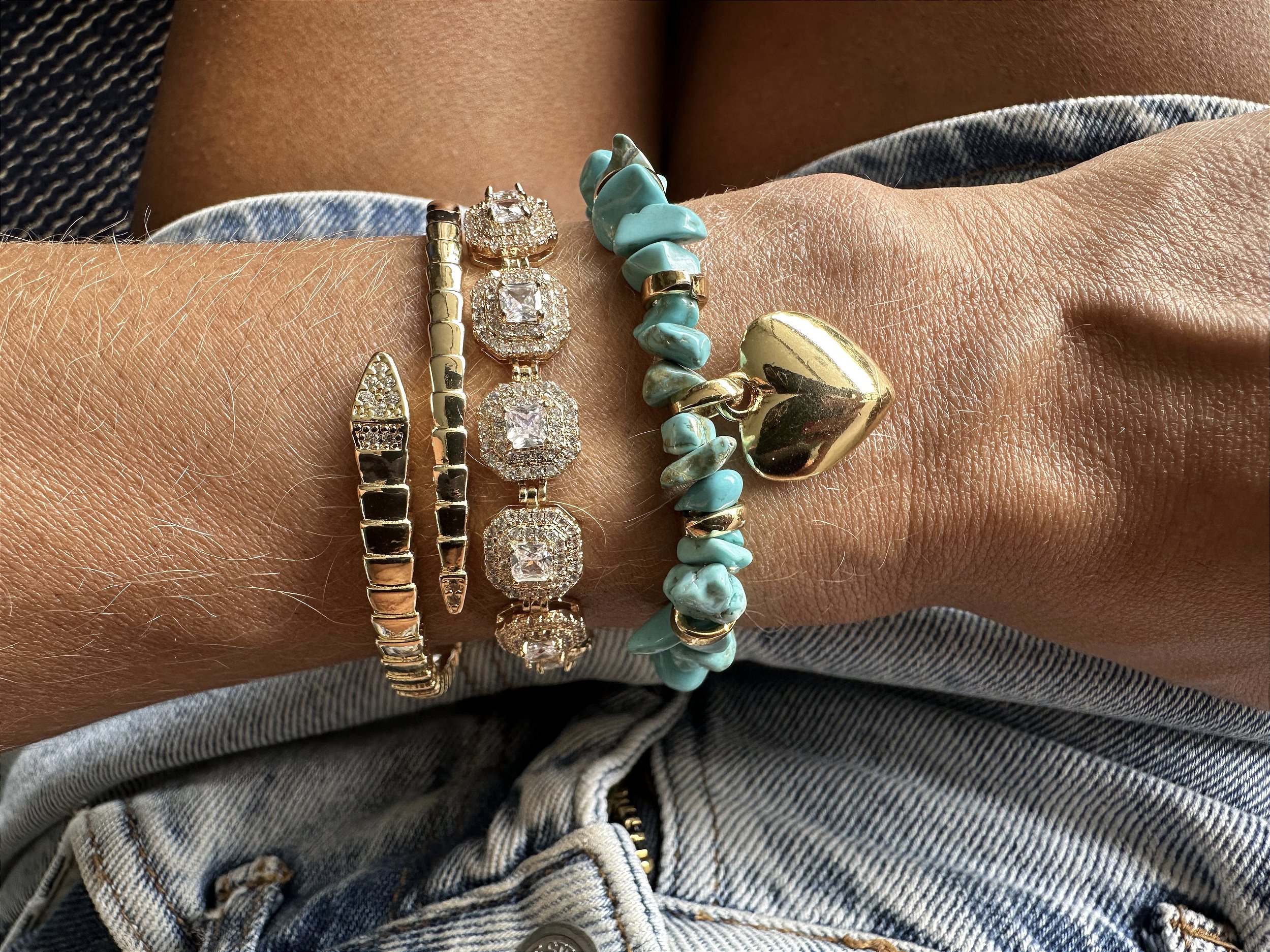 Kit composto por 3 pulseiras nos tons dourado e azul com pingente coração.