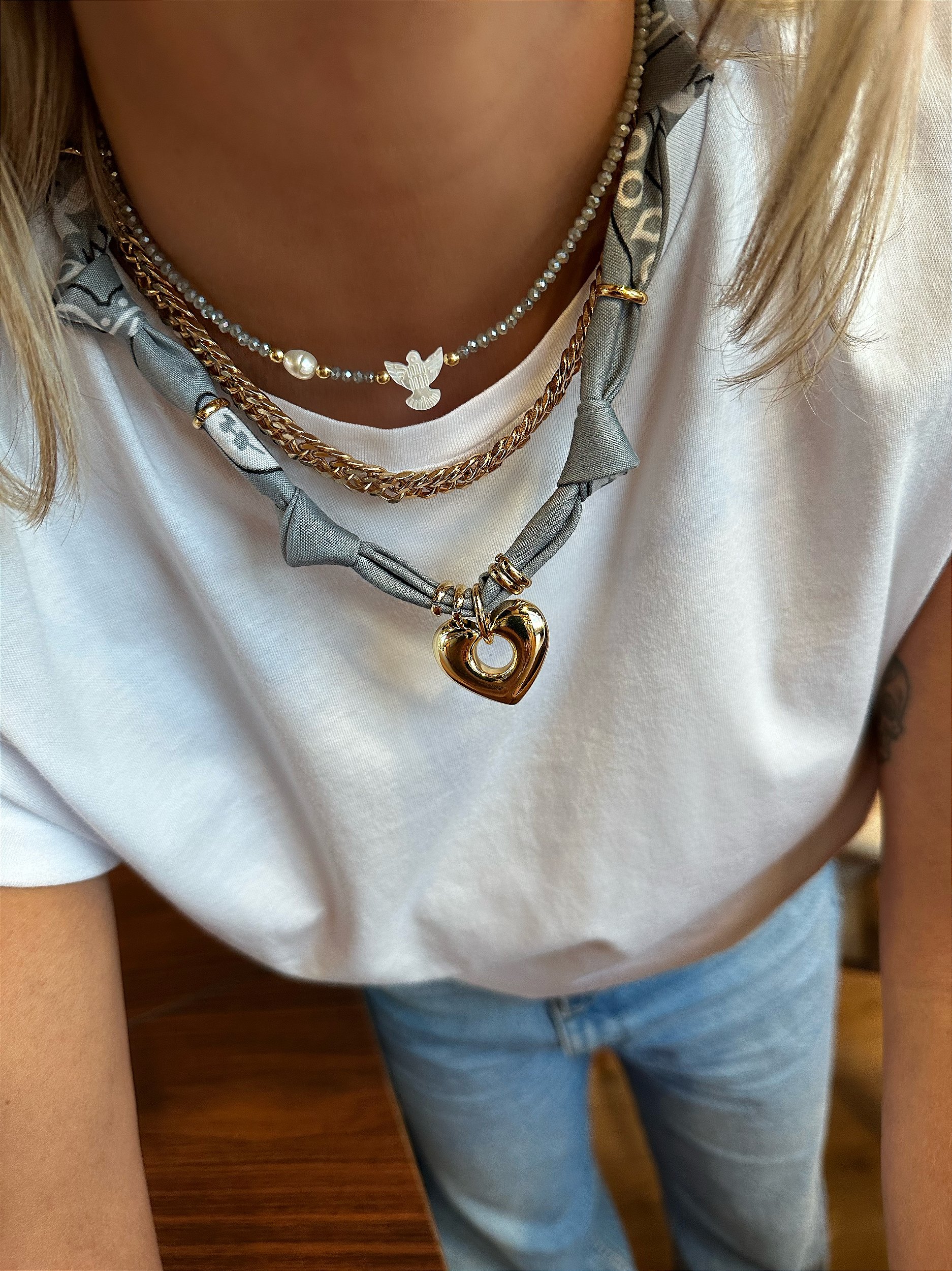 - 1 colar bandana cinza com pingente coração vazado dourado.