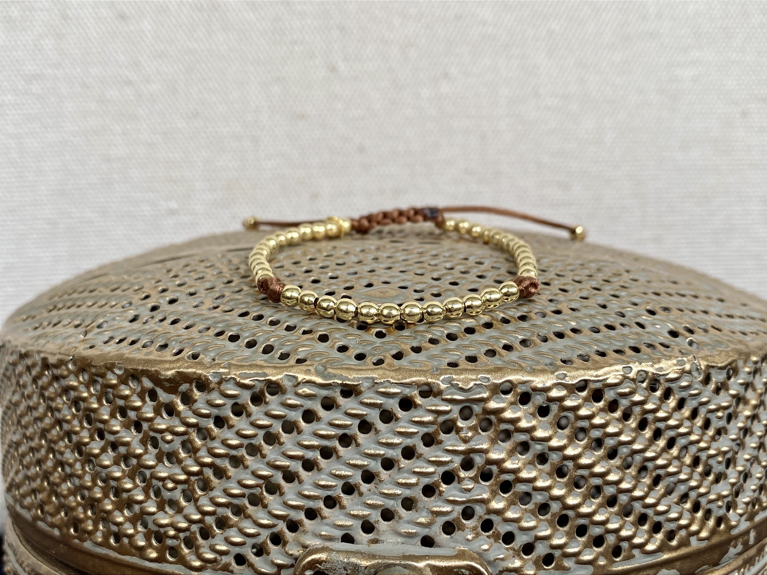 Pulseira feita com cordão acetinado e mini bolinhas latão.
