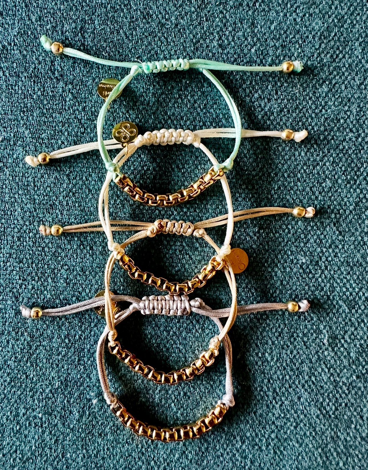 Pulseira com corrente dourada central e detalhe das cordinhas de seda nas laterais. Essa é pulseira é atemporal e muito prática para usar no dia a dia.