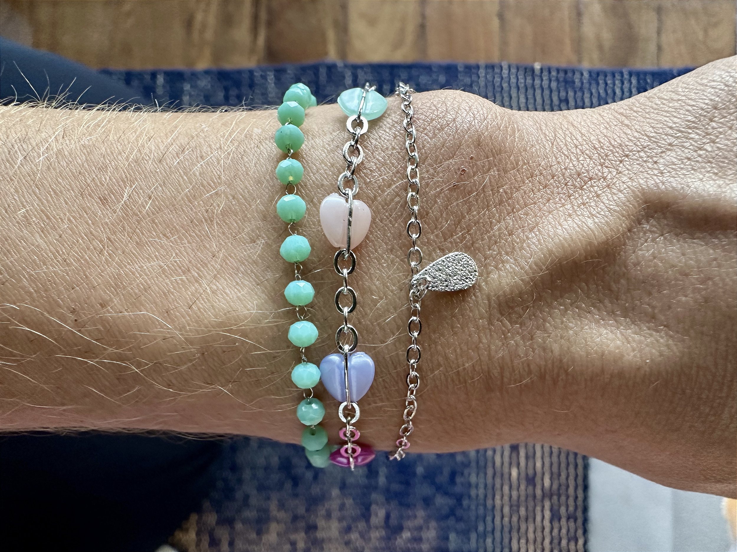 Pulseira composta por 3 voltas de correntes, sendo elas, uma corrente com pingentes de gota, corrente com corações coloridos e a última volta de cristais azuis. Perfeita para quem ama delicadeza e Pulseirismo!