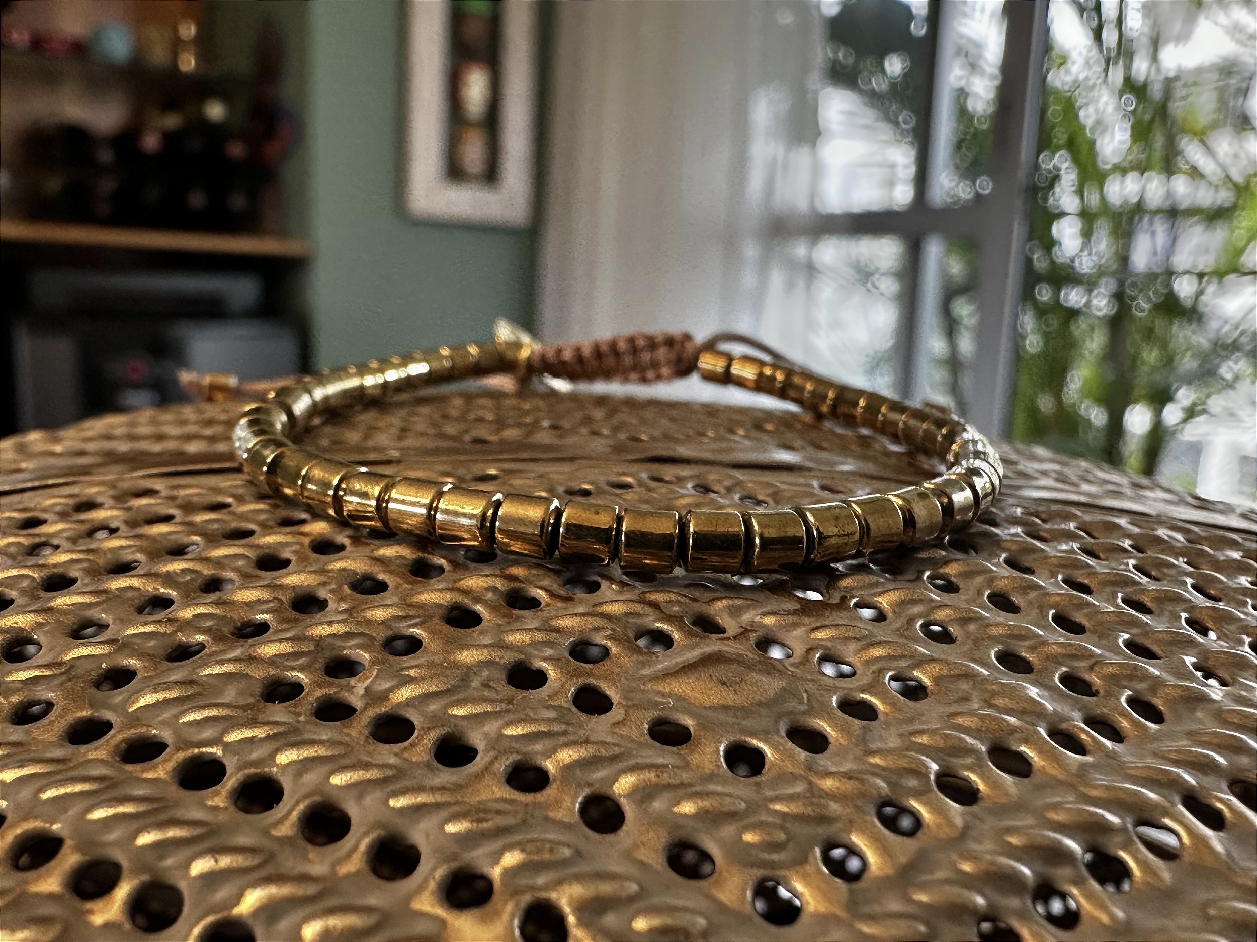 Pulseira hematita formato flexa com fechinho de cordinha.
