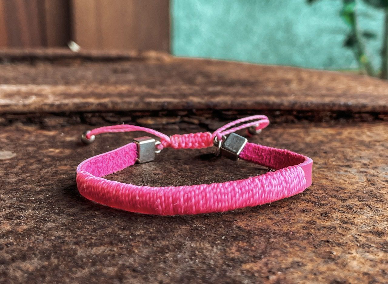 Pulseira de courinho sintético rosa com linha central e cordinhas ajustáveis.