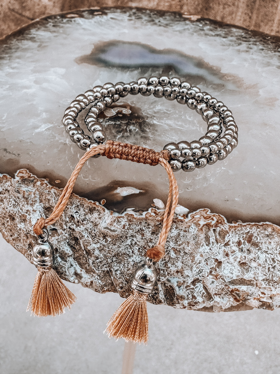Pulseira versátil sendo 3 voltas com um único fêcho de cordinhas ajustáveis ao pulso. O detalhe dos pingentinhos são puro charme!!