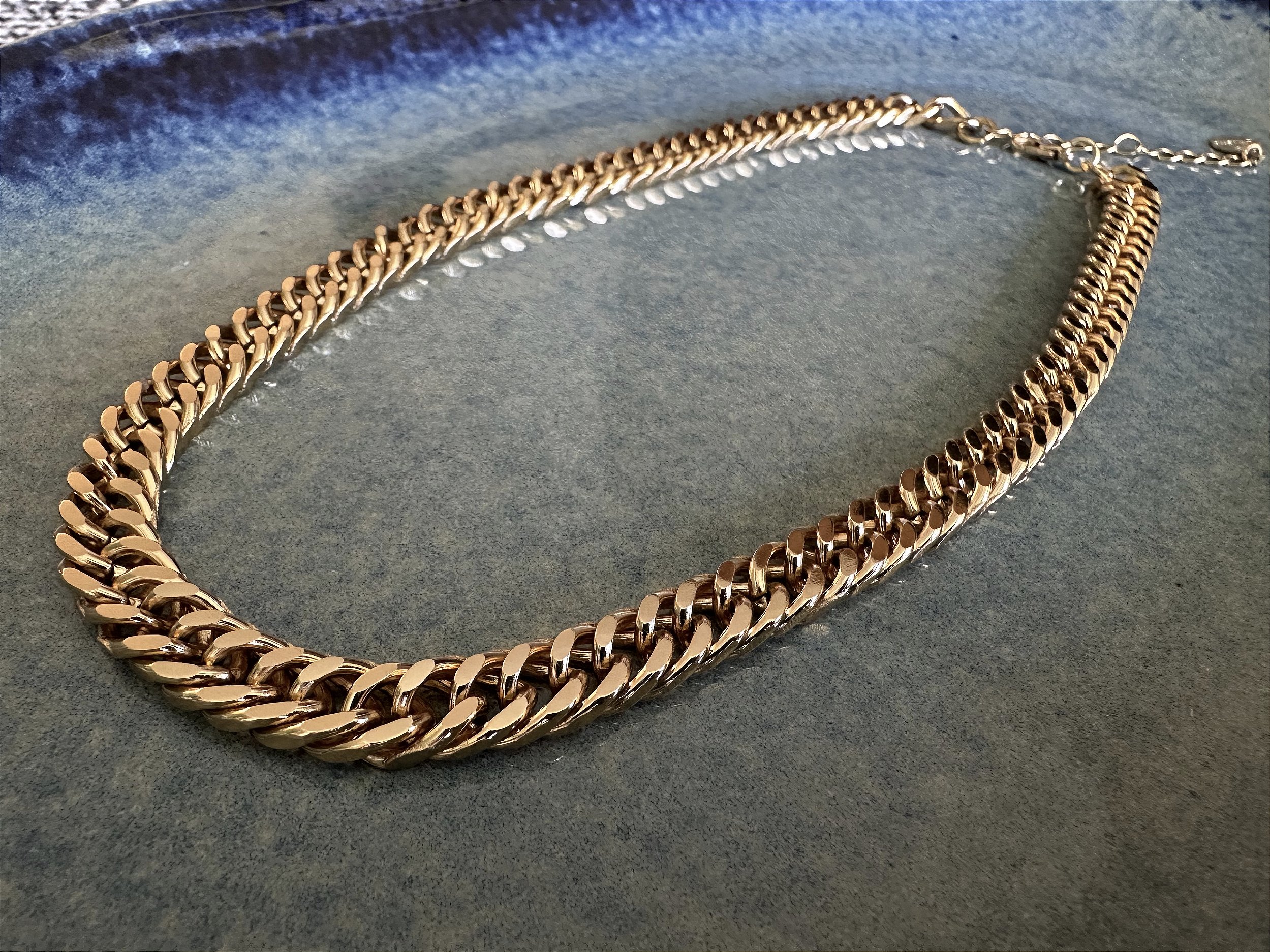 O colar elos dourado é uma tendência que chegou e ficou, ele vai bem tanto com looks casuais como com os mais sofisticados.